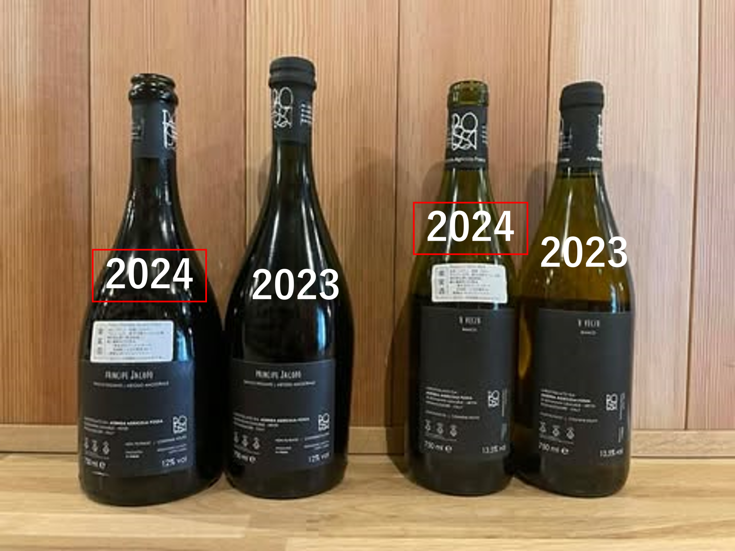 今回届いたプリンチペ ヤコポ&ウ ヴェチウ2024VTのワインのロット番号が、なんと2023VTのロット番号と全く同じ表記…! ハイディに確認したところ、中身はちゃんと2024VTのワインということでしたので、そのままリリースすることにしました!とはいえ、ロット番号もエチケットも全く一緒(瓶の形は微妙に違いますが)なので、この2アイテムは見分けが付くように輸入者シールを2024VTは変更しています!詳細は下の画像をご参考に!!