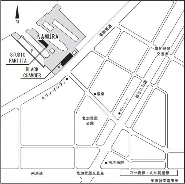 地下鉄四つ橋線 北加賀屋駅より徒歩10分。上の地図のセブンイレブンの辺りに行くとこちらの写真の建物が見えますので、左側よりご入場ください。