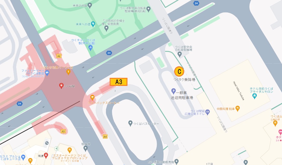 送迎バス乗車をご希望の方は、TXつくば駅[A3]出口を出てすぐ目の前のロータリー(つくば駅一般車送迎用駐車場)にお越しください。