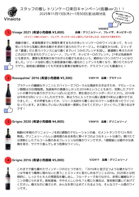 みなさまこんにちは!ヴィナイオータに入社して間もなく丸12年、ここ最近、他のスタッフが紹介してくれる時の枕詞が「最古参」になっている(笑)つくば本社小神野事務所の佐藤です。4月には、こちらの「スタッフの推し」キャンペーンでオーストラリアの造り手2軒を推させて頂きましたが、年内最後となる今回はもちろん!間もなく来日してくれるトリンケーロを激推しさせていただきます!